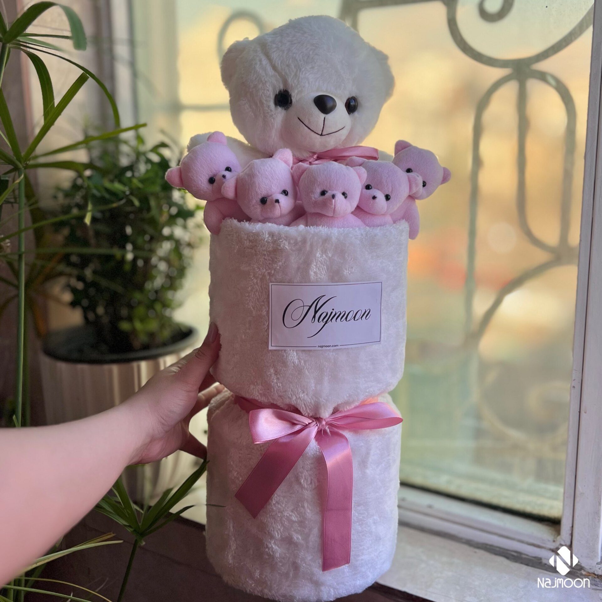بوکت عروسک خرس و دستگل خرسی خارجی صورتی سفید