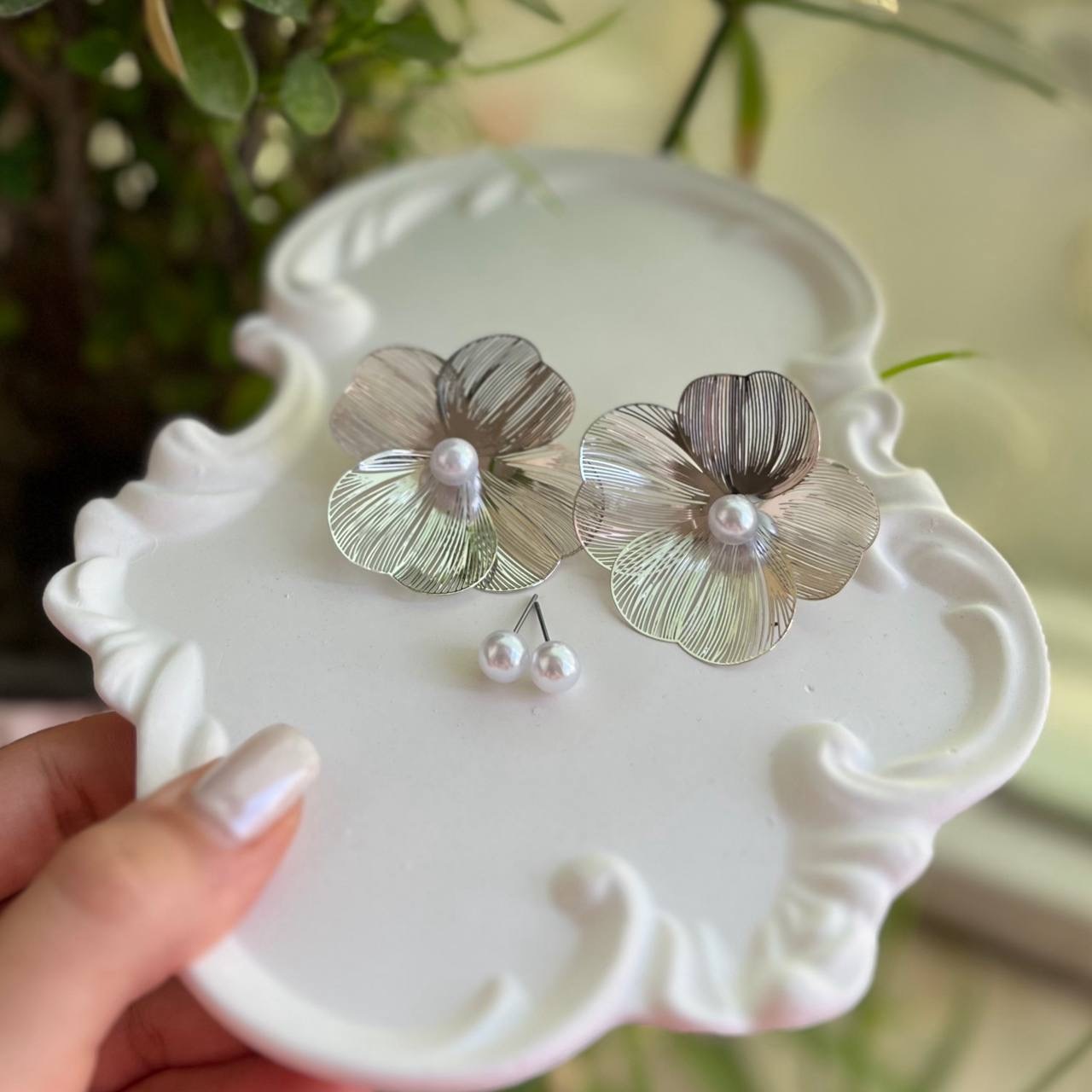این گوشواره شامل یک جفت گوشواره ی گل و یک جفت گوشواره مرواریدی میباشد