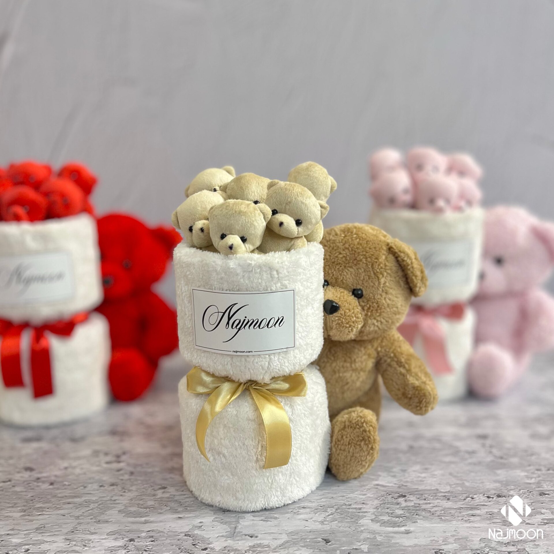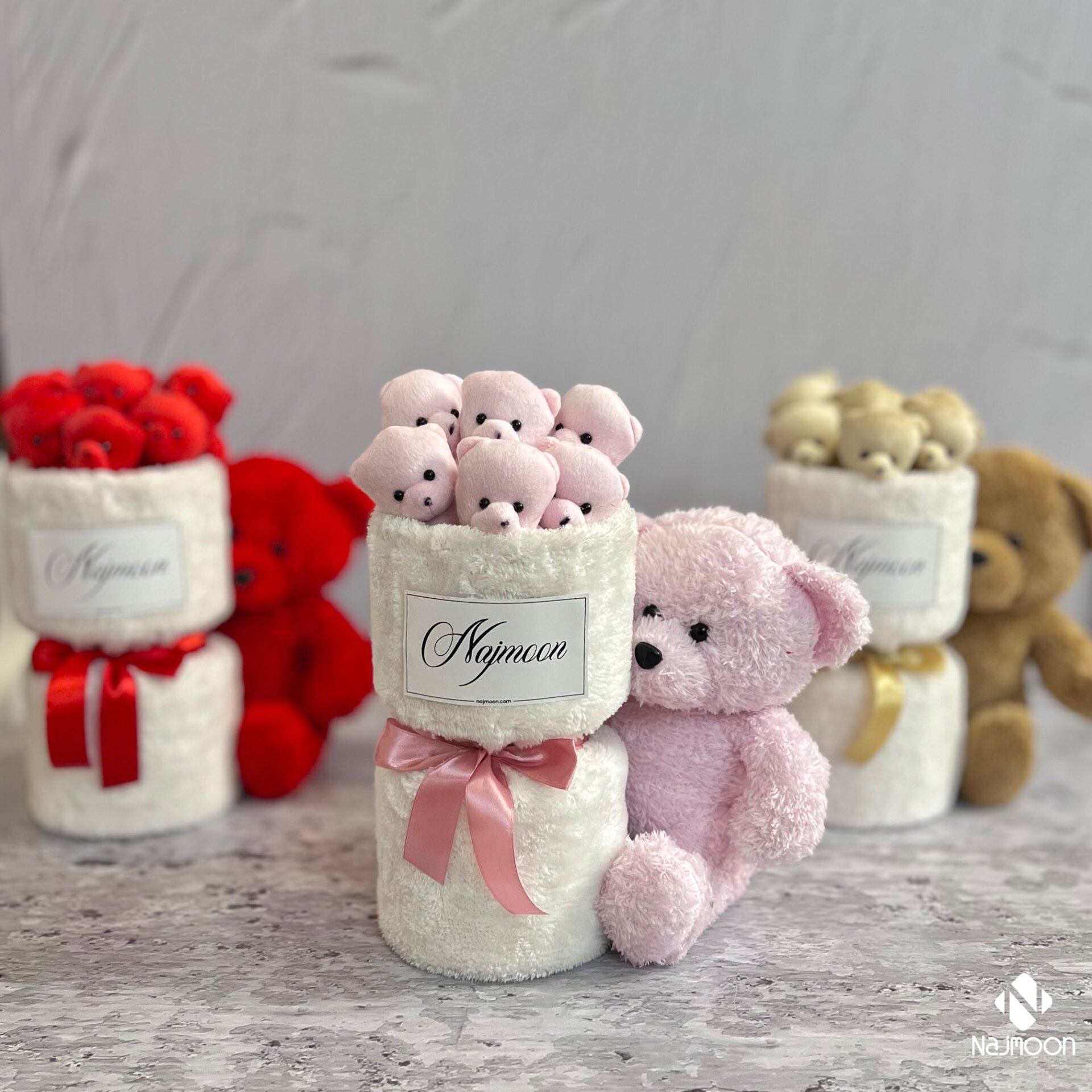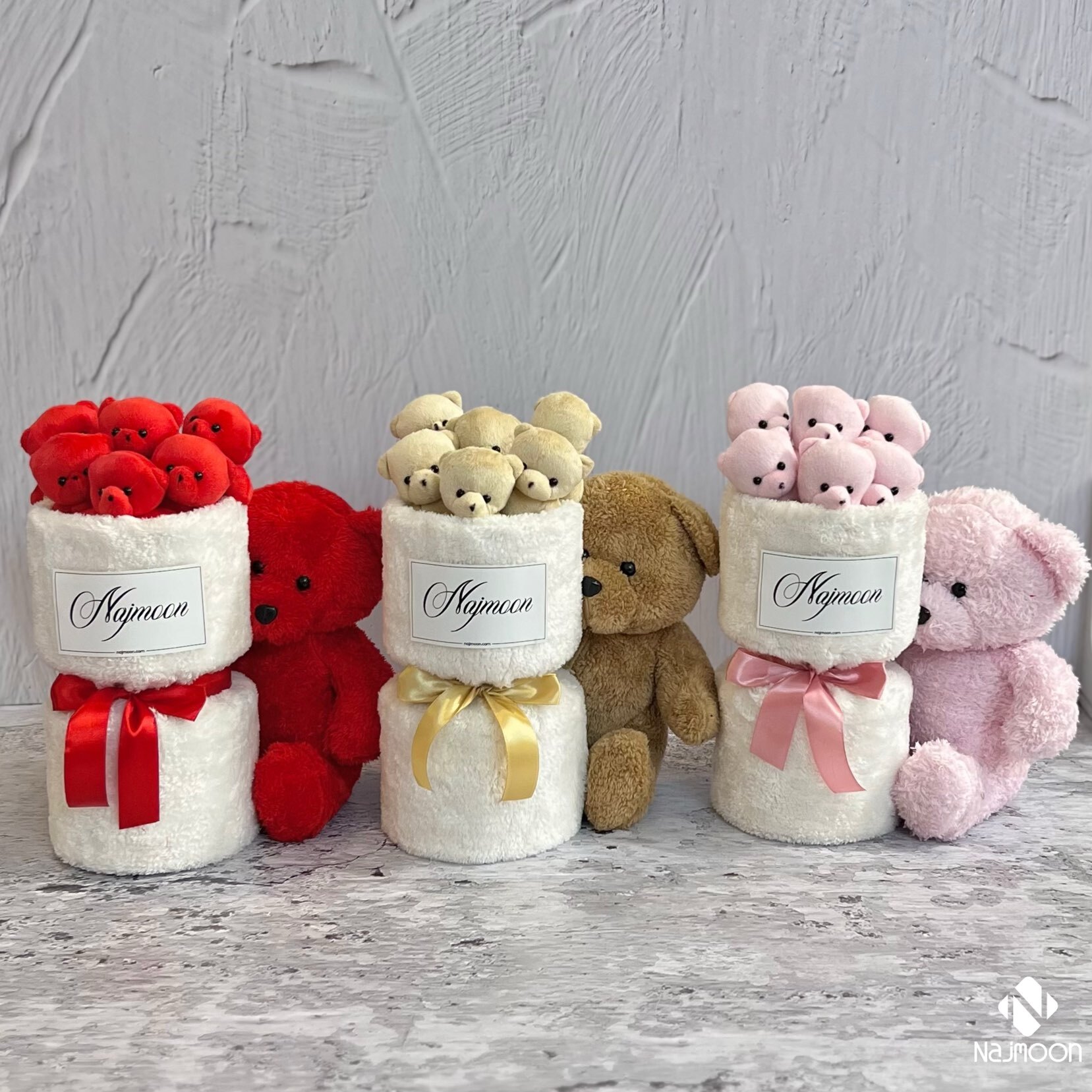 بوکت رومیزی با خرس در آغوش و دستگل عروسکی خرس بغل در سه رنگ